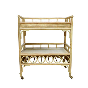 The Kokomo Rattan Bar Cart is a statement piece for relaxed gatherings. Its rounded edges and woven rattan shelves create a light, airy feel. Easily styled as a drinks trolley, dessert stand or kitchen helper. Sturdy wheels make moving from room to patio a breeze. A versatile rattan bar cart that brings coastal charm to any occasion.